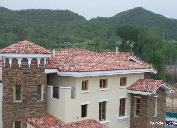 3、西班牙瓦本身具有弧度,使得整体屋面具有较好的层次感,又因多种颜色混铺,使得整体屋面具有很好的视觉效果;