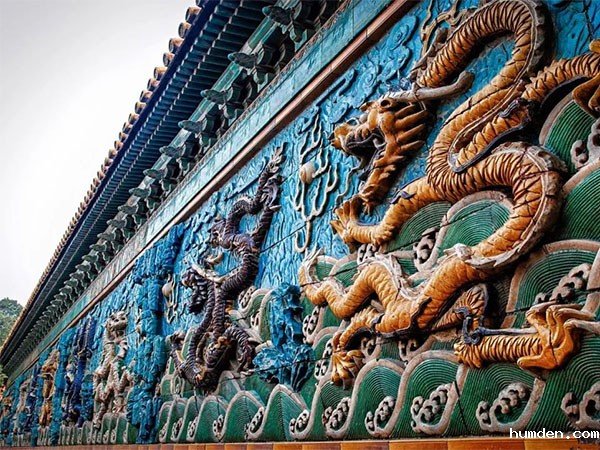 早在南北朝时期就在建筑上使用琉璃瓦件作为装饰物,到元代时皇宫建筑大规模使用琉璃瓦。紫禁城在明代建造之初,其屋顶就使用了以黄色为主的各色琉璃瓦。大面积的黄色琉璃瓦使得整个紫禁城呈现出金碧辉煌的气派,体现了皇家宫殿的壮丽和皇权的威严。要说对琉璃瓦运用较为传神的还得非九龙壁莫属。